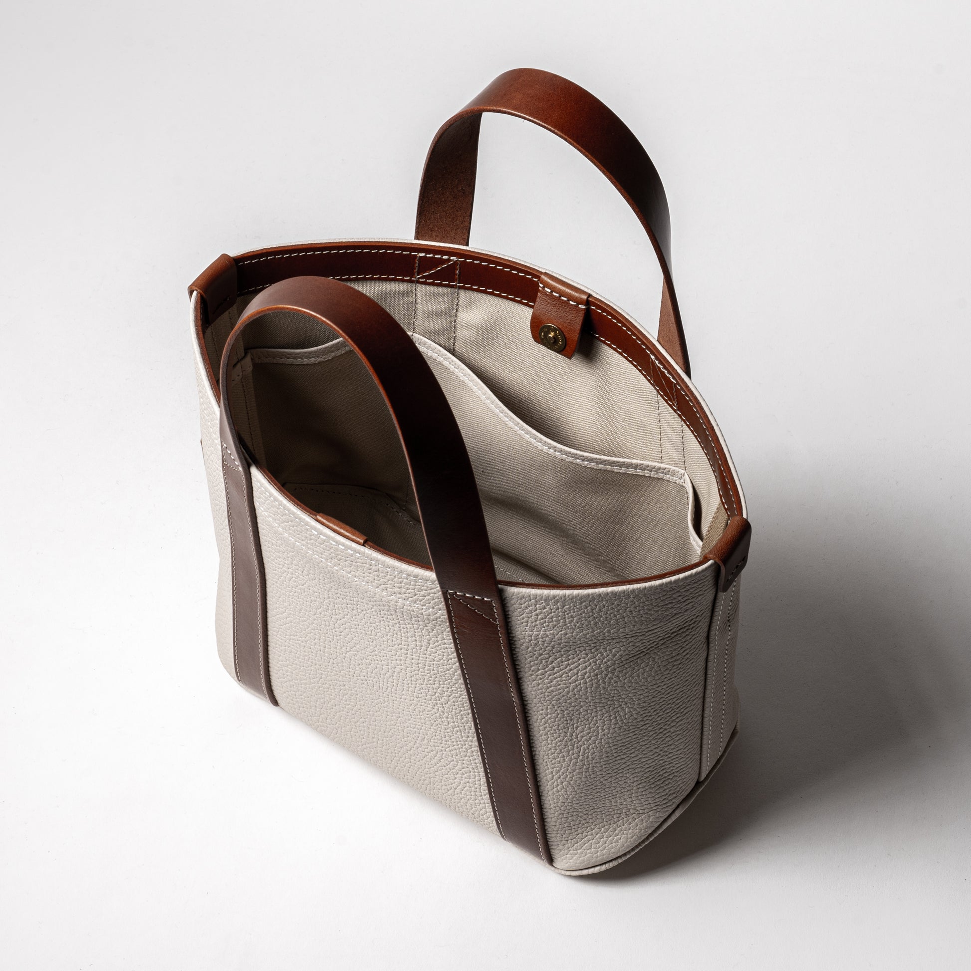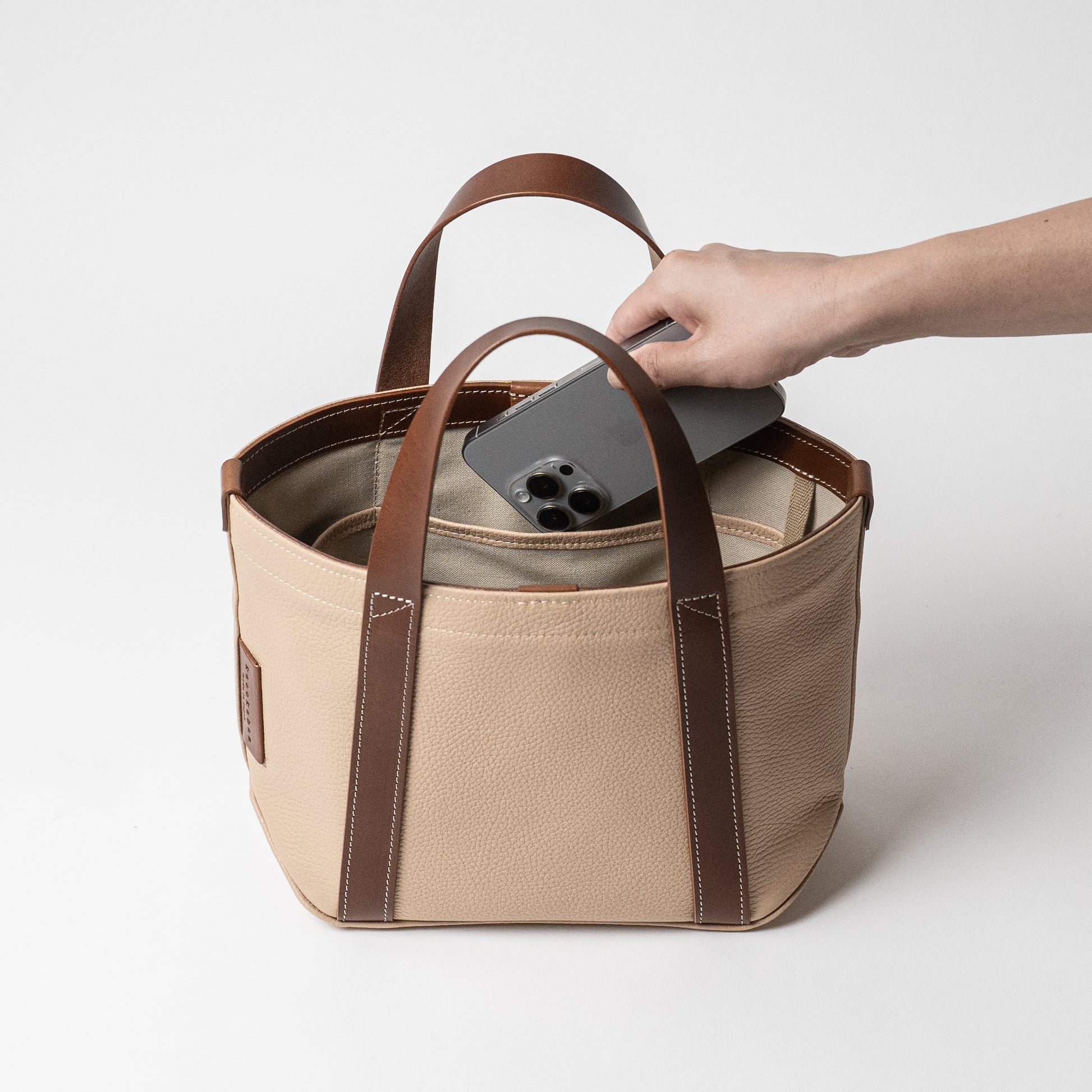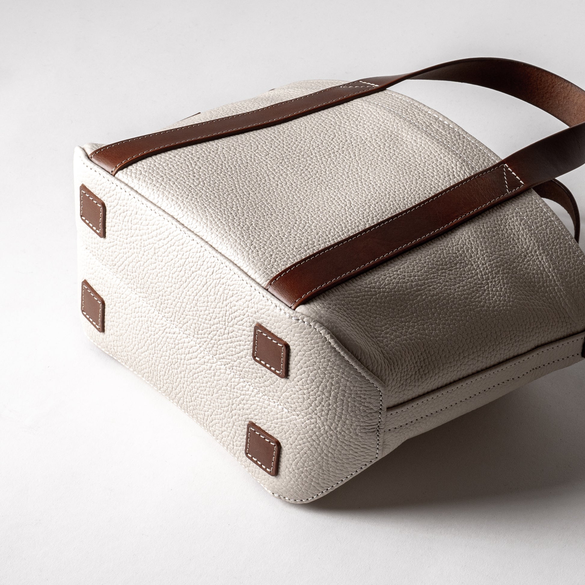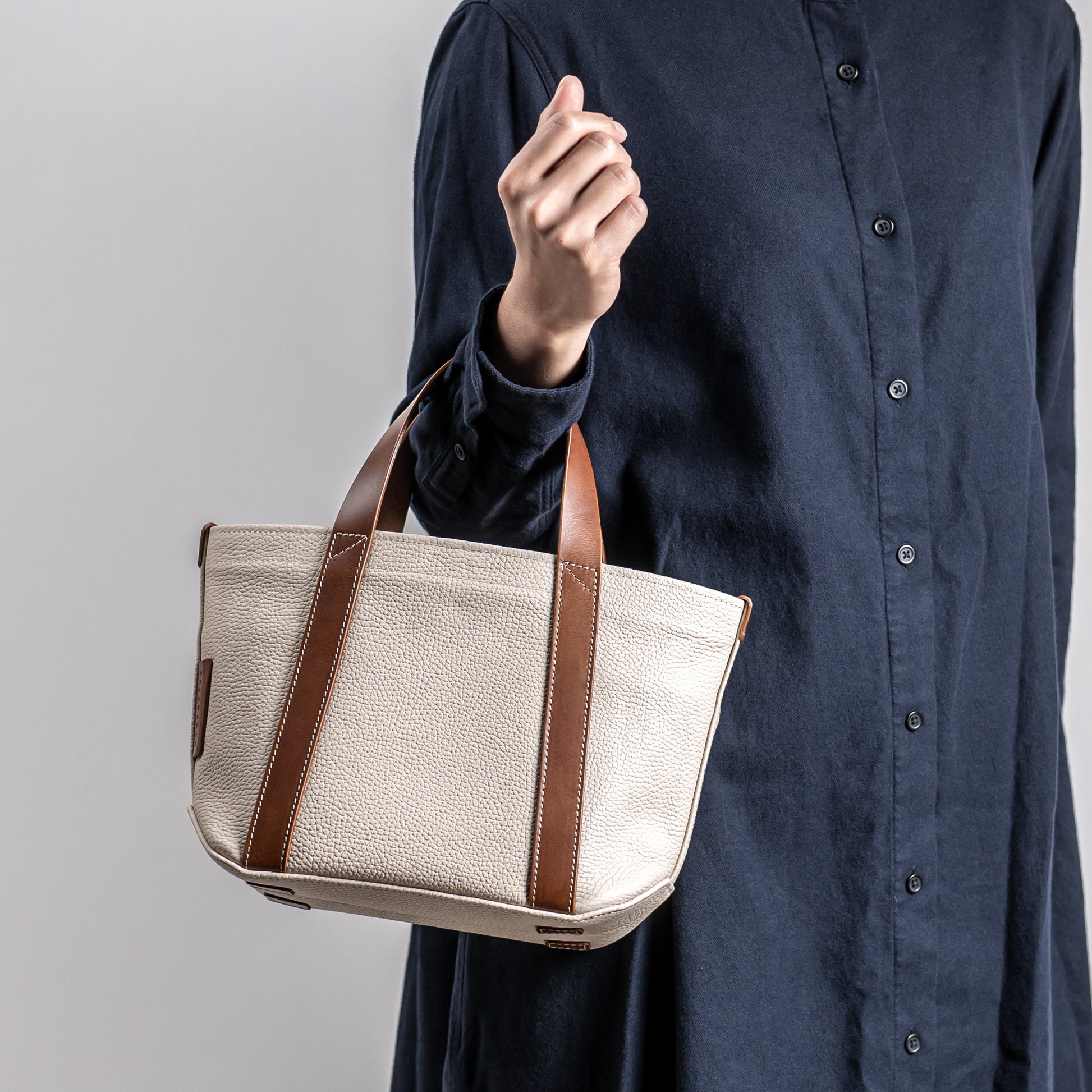 バッグ本体とハンドルで構成されたミニマムなデザインは男女問わずに毎日お使いいただけます。ちょっと変わった底の形状や、ハンドルの三角補強ステッチも魅力です。