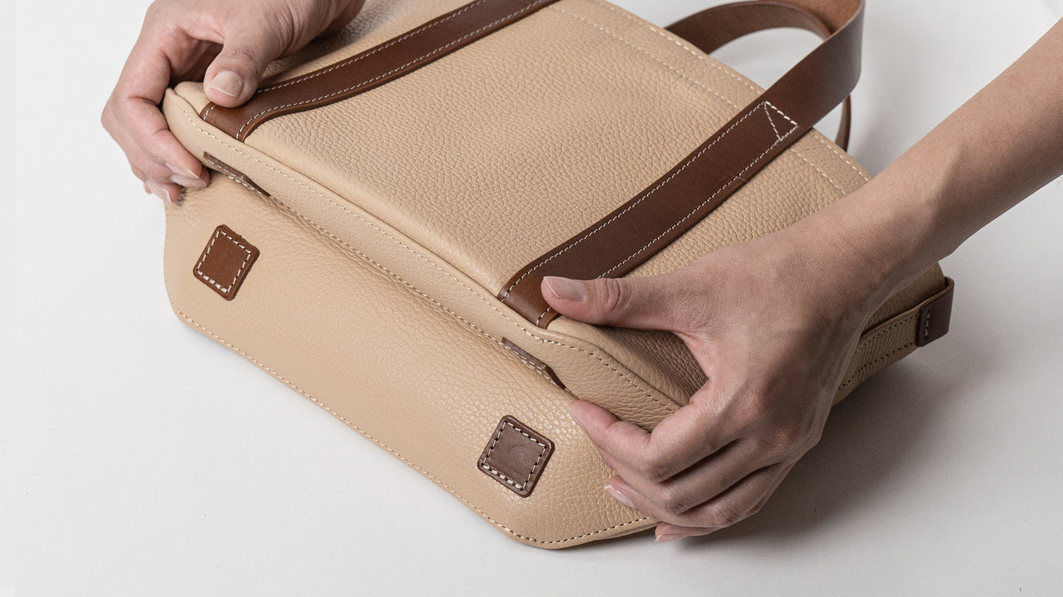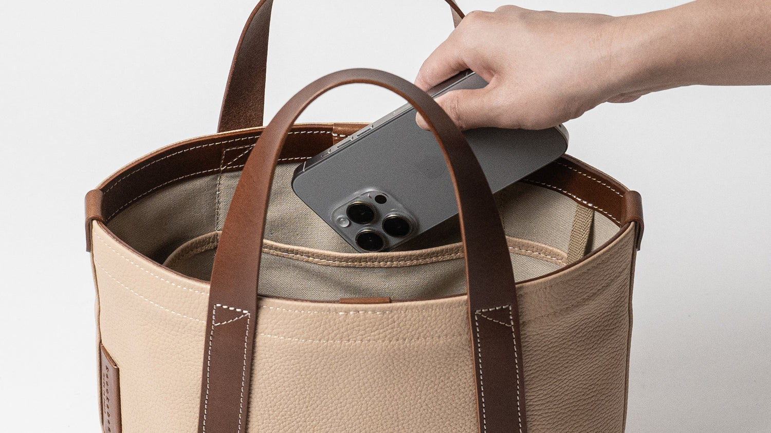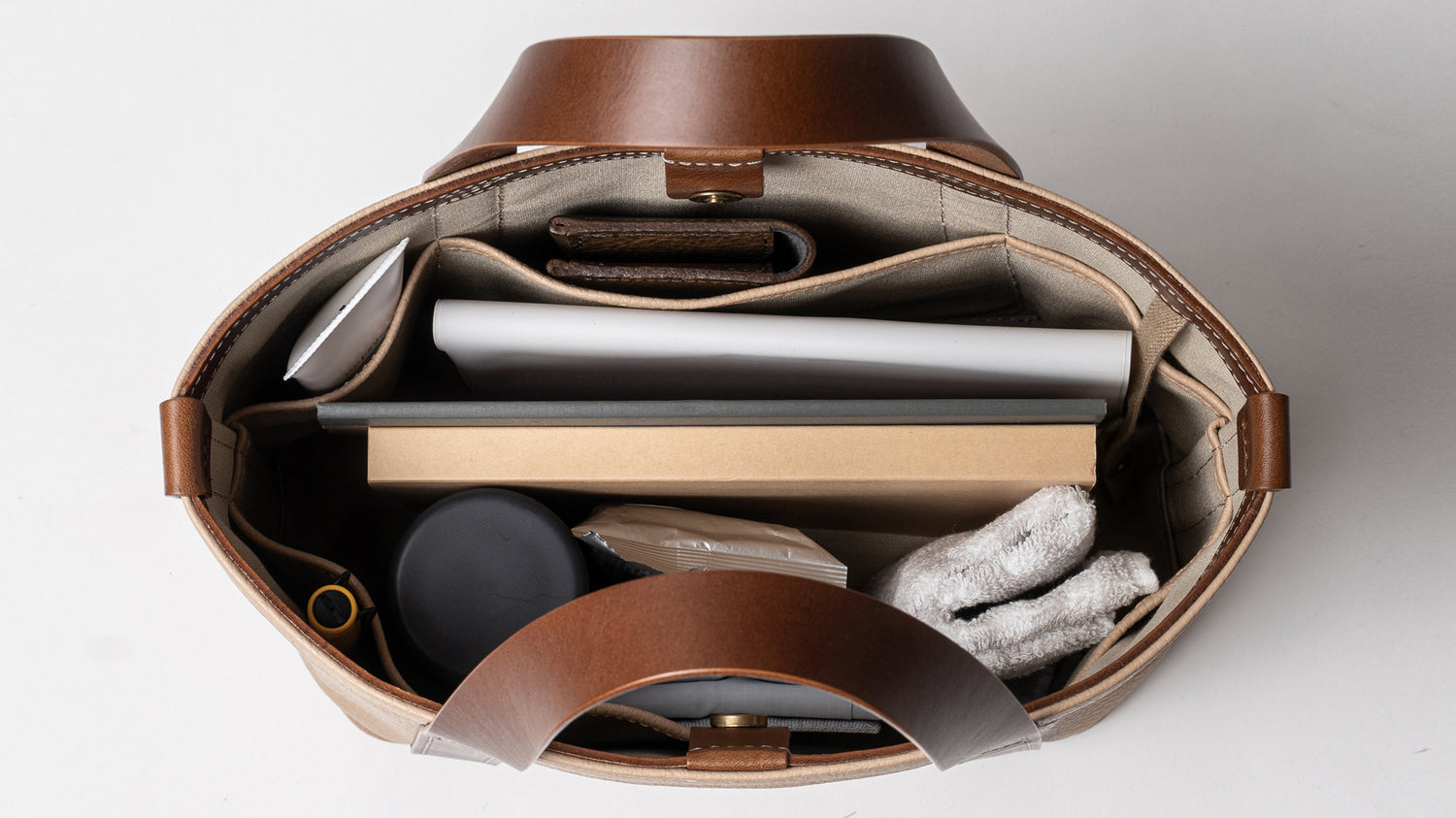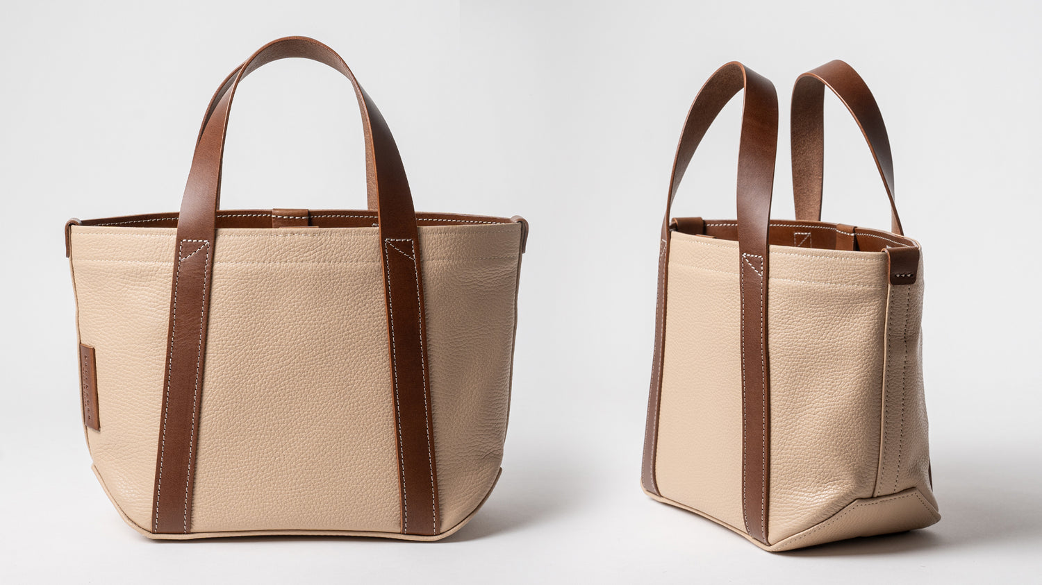バッグ本体とハンドルで構成されたミニマムなデザインは男女問わずに毎日お使いいただけます。ちょっと変わった底の形状や、ハンドルの三角補強ステッチも魅力です。