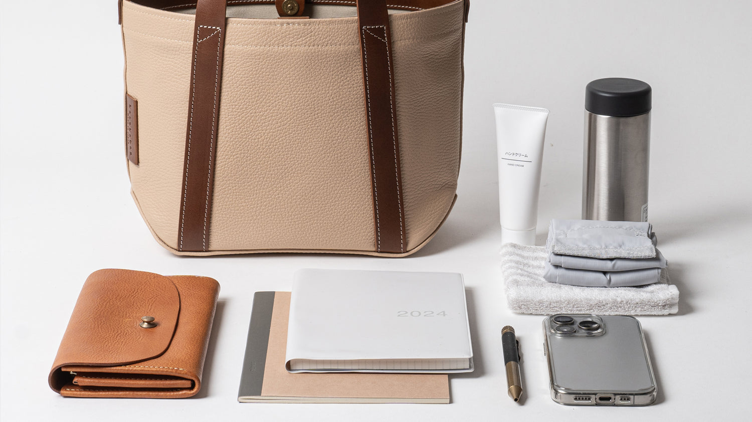 A5ノートと長財布、スマートフォンと水筒など、毎日のお出かけに必要な荷物を機能的に収納できます。