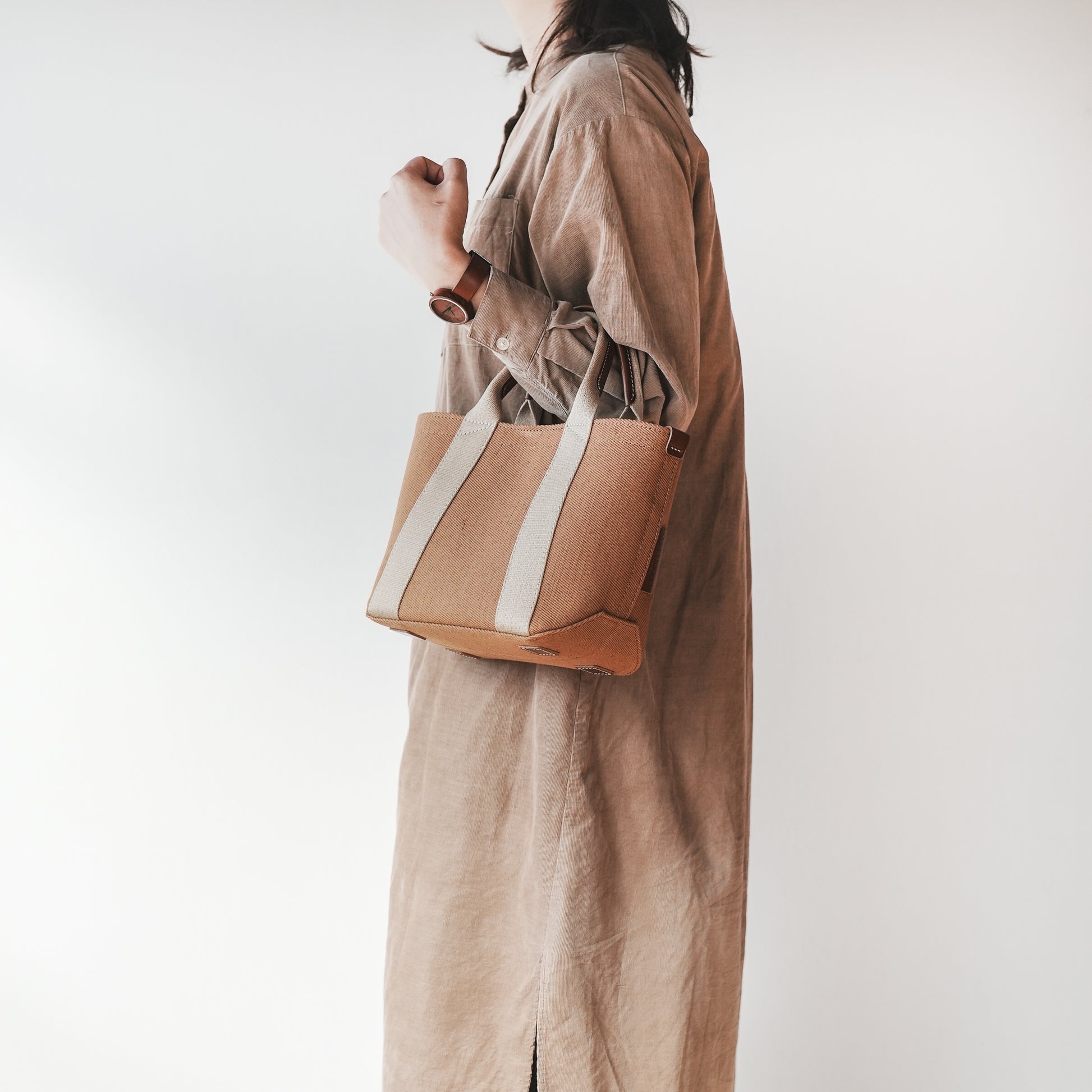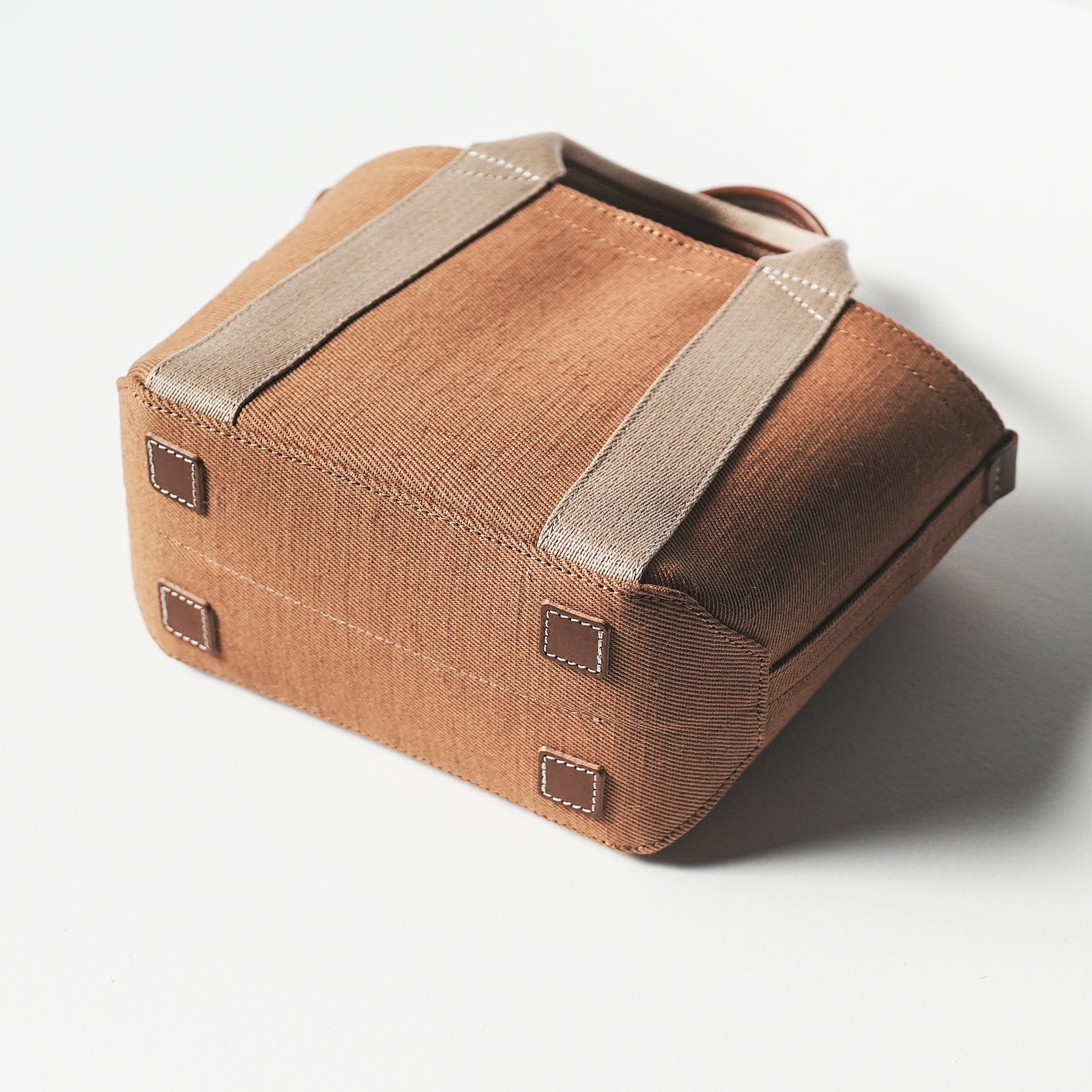 バッグ本体とハンドルで構成されたミニマムなデザインは男女問わずに毎日お使いいただけます。ちょっと変わった底の形状や、ハンドルの三角補強ステッチも魅力です。