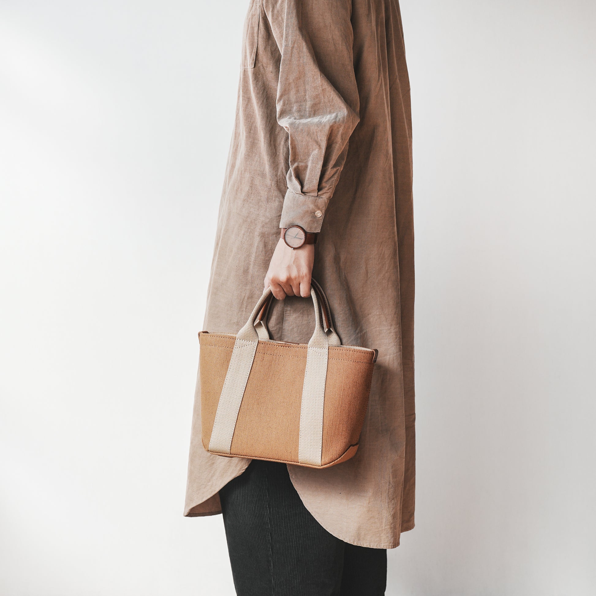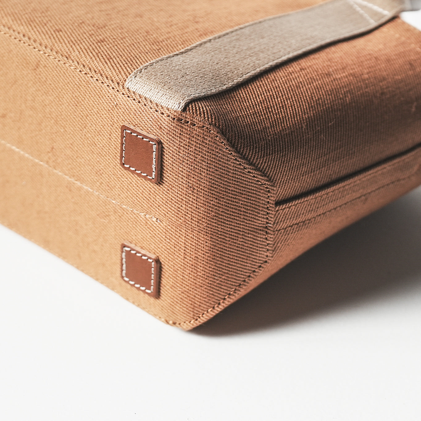 手で持つトートバッグだからこそハンドルにも拘りました。厚みとコシのある日本製アクリルテープに革を縫い付けることで、握りやすく、手に馴染んできます。また、一般的なアクリルテープと違い、バッグ本体と同じ綾織にすることで上品な雰囲気が魅力です。