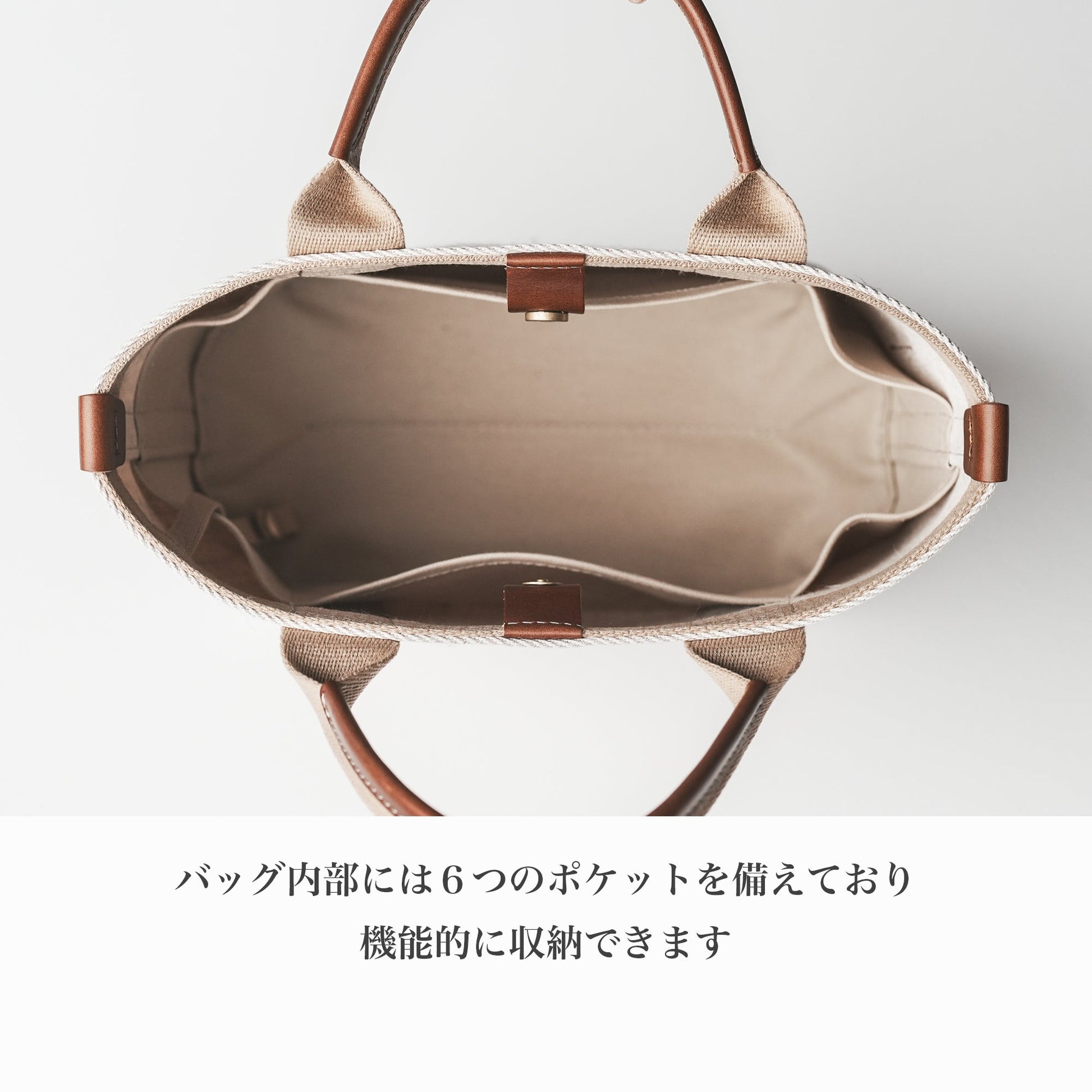 バッグ内部には大ポケットが2個、小ポケットが4個あり、機能的に収納できます。