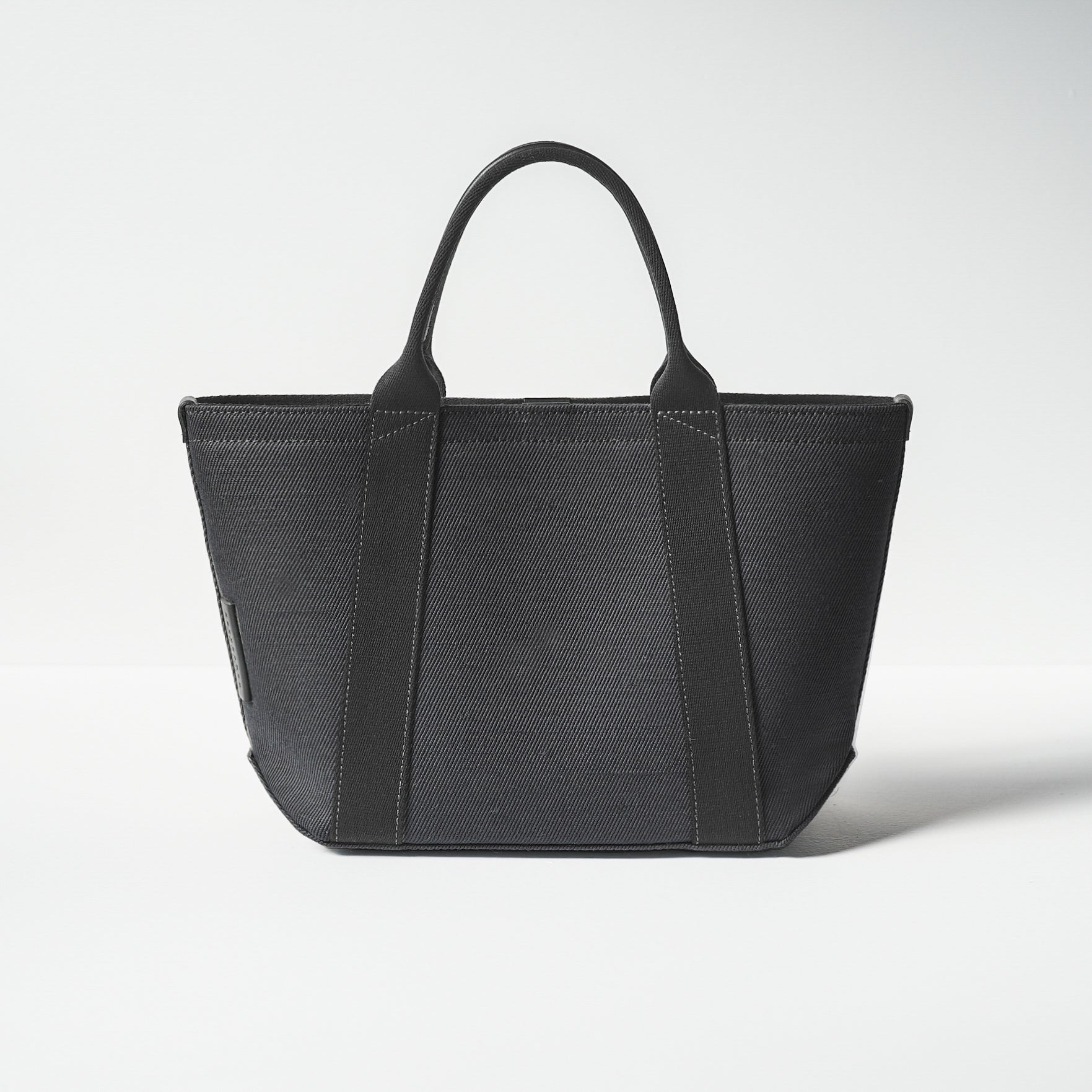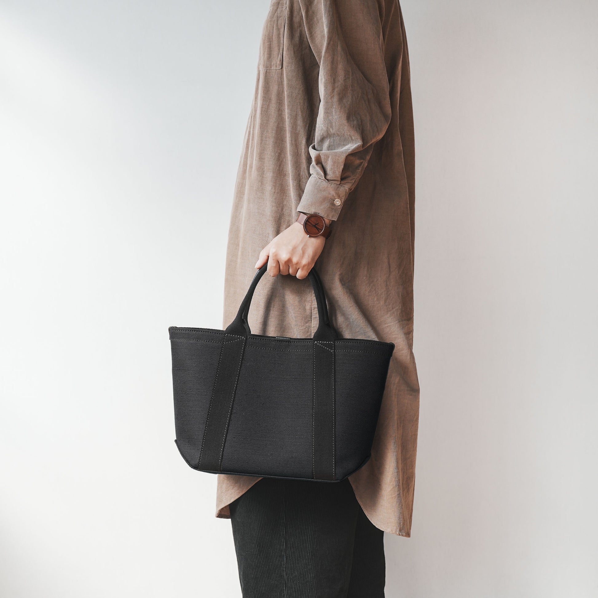 手で持つトートバッグだからこそハンドルにも拘りました。厚みとコシのある日本製アクリルテープに革を縫い付けることで、握りやすく、手に馴染んできます。また、一般的なアクリルテープと違い、バッグ本体と同じ綾織にすることで上品な雰囲気が魅力です。そして、Mサイズは肩掛けできるロングハンドルも選ぶことができます。
