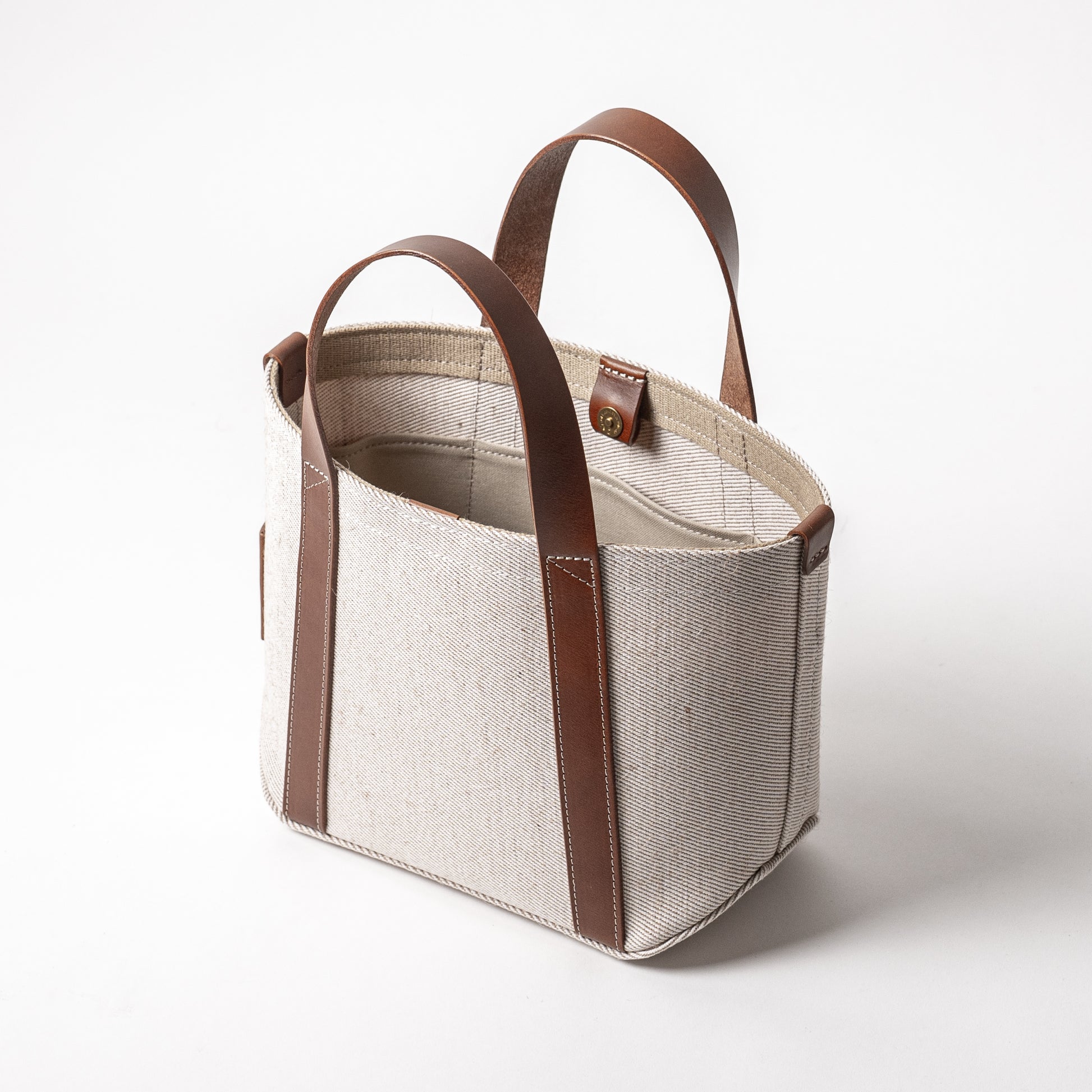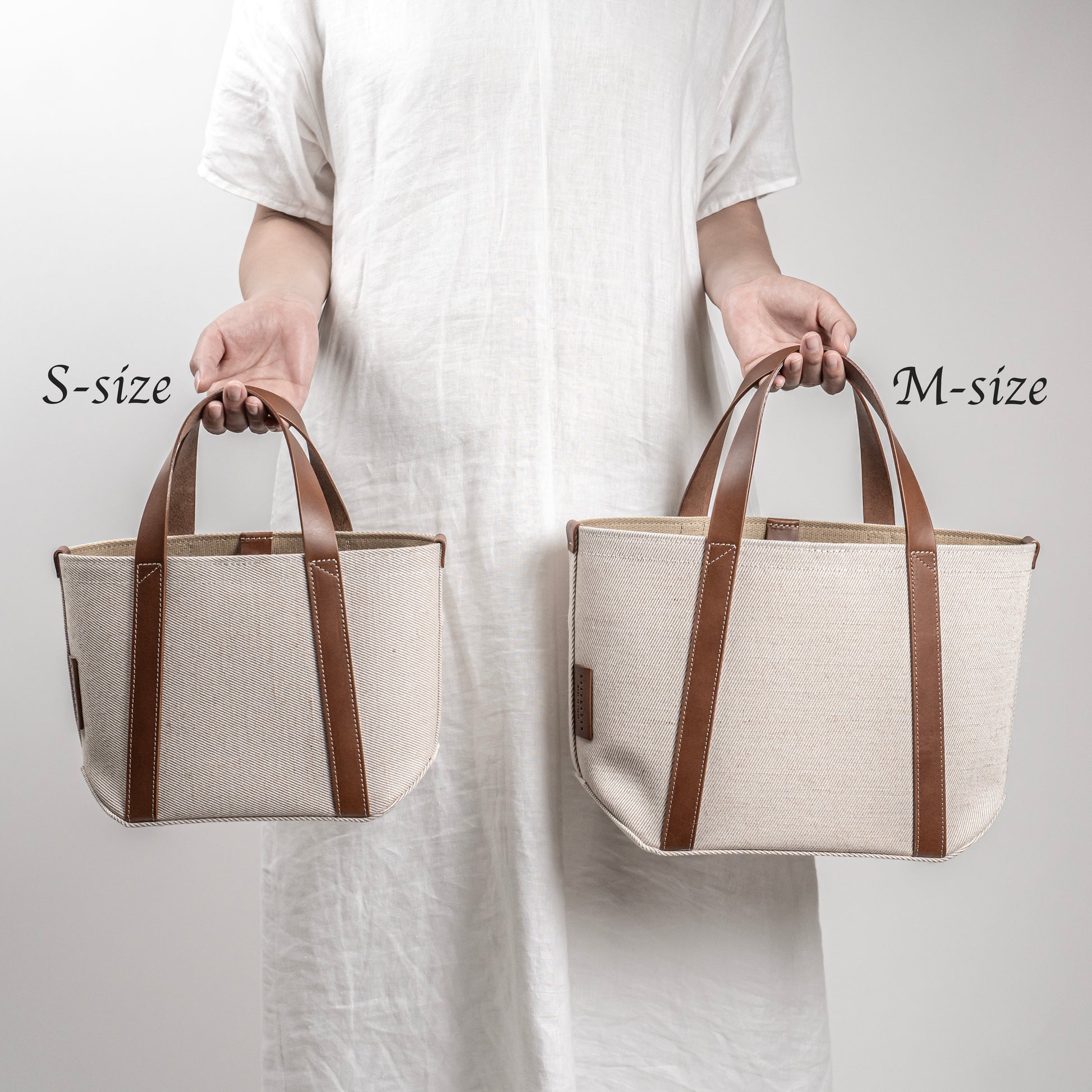<2サイズ>レザーハンドル 倉敷の綿麻帆布とヌメ革で仕立てた 丈夫で軽量なトート <生成り ecru>