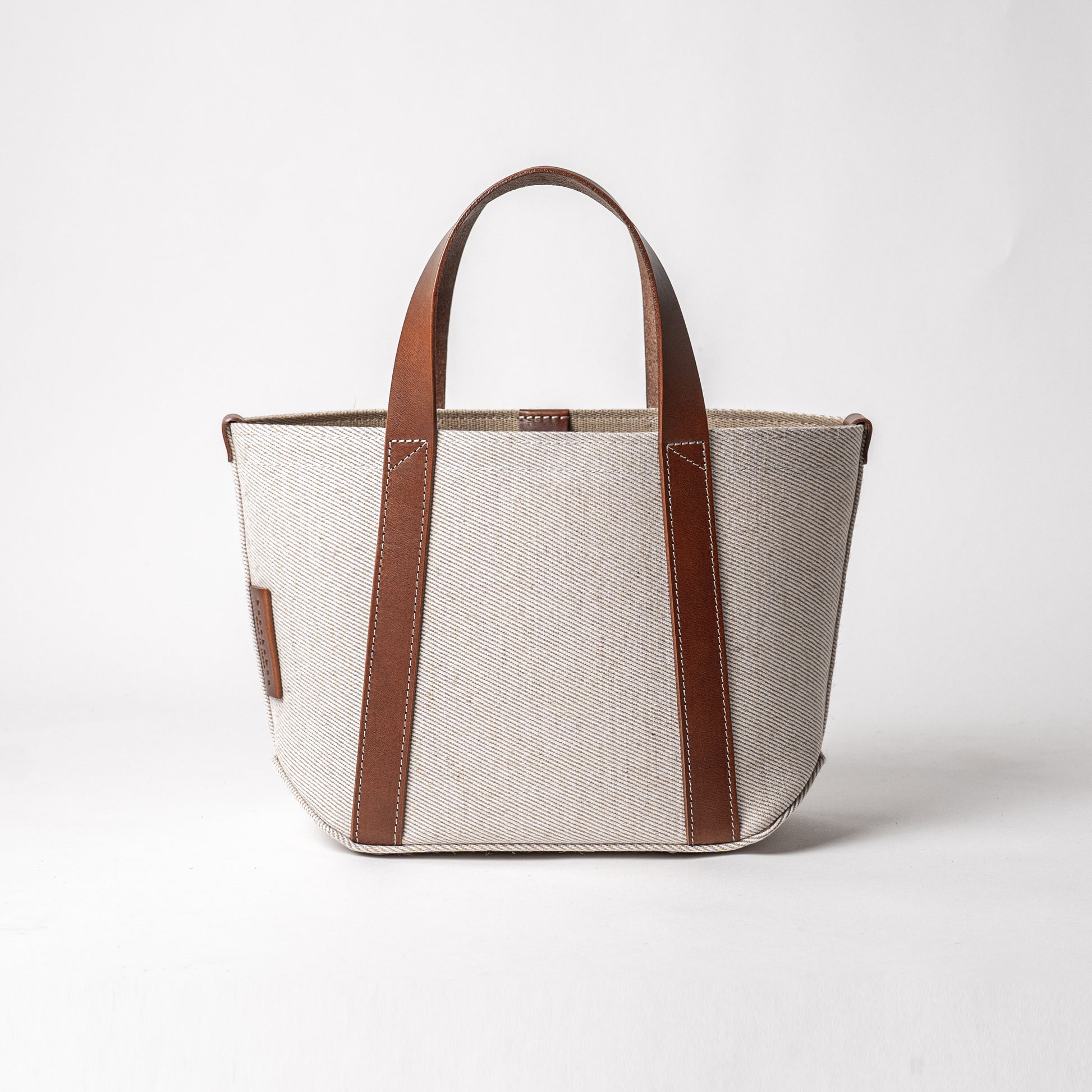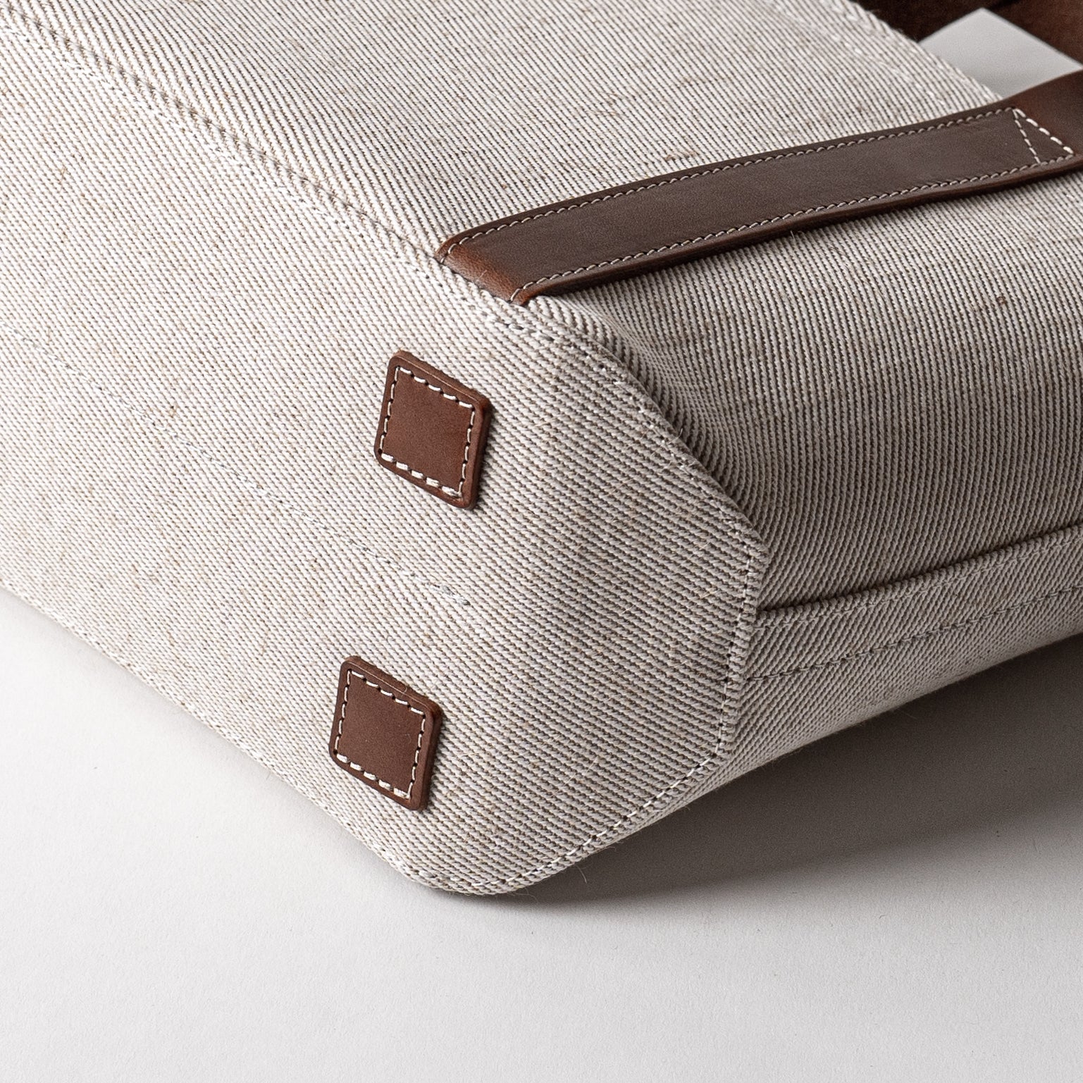 バッグ本体には90年以上の歴史を誇る「荻野製織」で丁寧に製造される綿麻素材の特別な綾織帆布を使用。この帆布は旧式のシャトル織機によって時間をかけて織られることで生まれる綾織の美しく自然な風合いと、使い込むほどに味わいが増す丈夫さが魅力です。綿と麻を混紡することで夏は涼しげに、冬は暖かみを感じる一年通して使いやすい素材です。