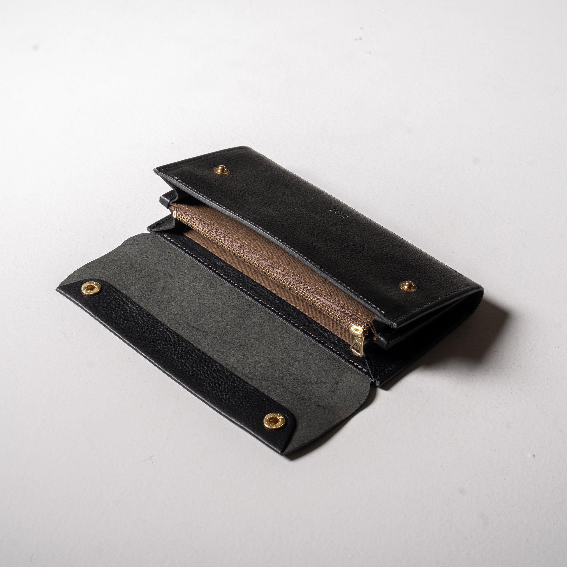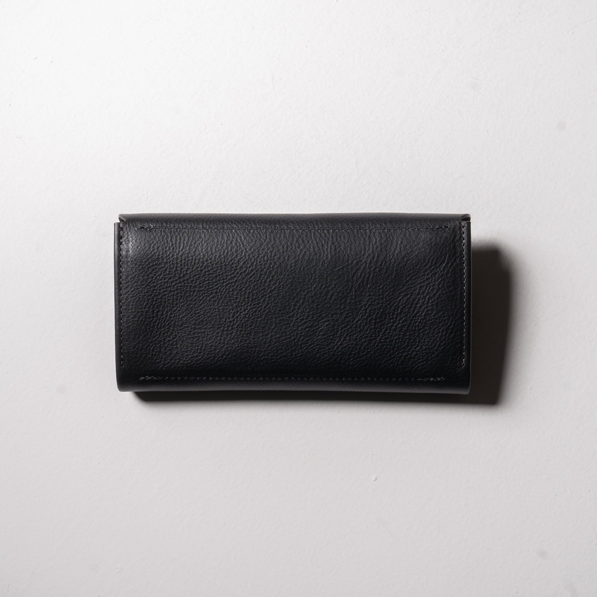 金具の色が見えなくなることで、視覚的なノイズが消え、まるで「一枚の革そのもの」を持ち歩いているような、洗練された塊(かたまり)感が生まれました。 縫い目を極力減らした一枚革の構造と相まって、スーツの内ポケットから出した時も、カフェのテーブルに置いた時も、凛とした知性を漂わせます。