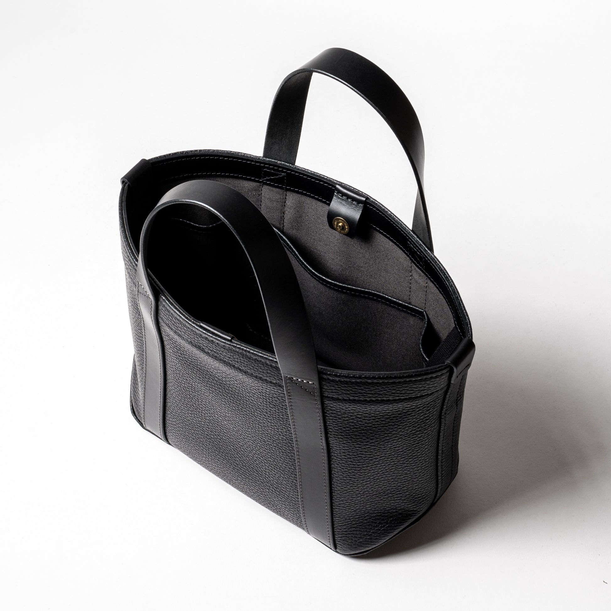 バッグ本体とハンドルで構成されたミニマムなデザインは男女問わずに毎日お使いいただけます。ちょっと変わった底の形状や、ハンドルの三角補強ステッチも魅力です。