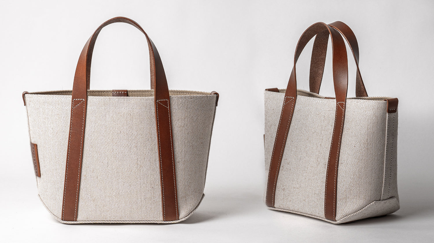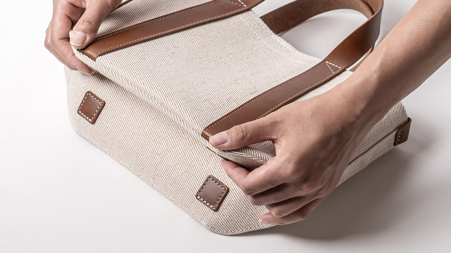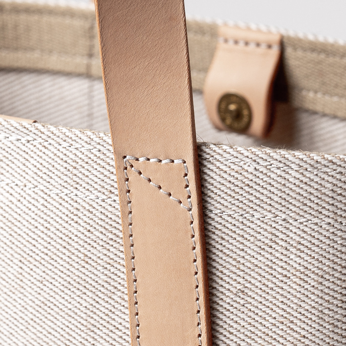 バッグ本体には90年以上の歴史を誇る「荻野製織」で丁寧に製造される綿麻素材の特別な綾織帆布を使用。この帆布は旧式のシャトル織機によって時間をかけて織られることで生まれる綾織の美しく自然な風合いと、使い込むほどに味わいが増す丈夫さが魅力です。綿と麻を混紡することで夏は涼しげに、冬は暖かみを感じる一年通して使いやすい素材です。