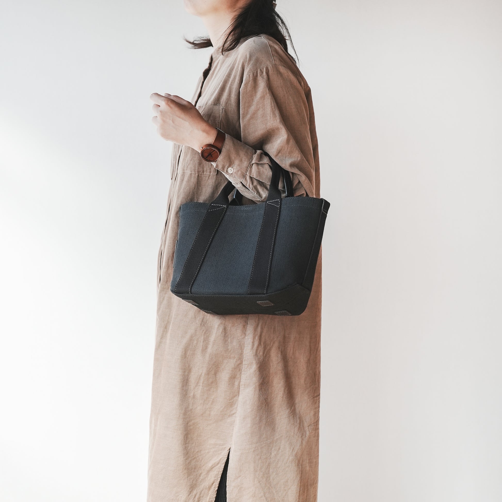 バッグ本体とハンドルで構成されたミニマムなデザインは男女問わずに毎日お使いいただけます。ちょっと変わった底の形状や、ハンドルの三角補強ステッチも魅力です。