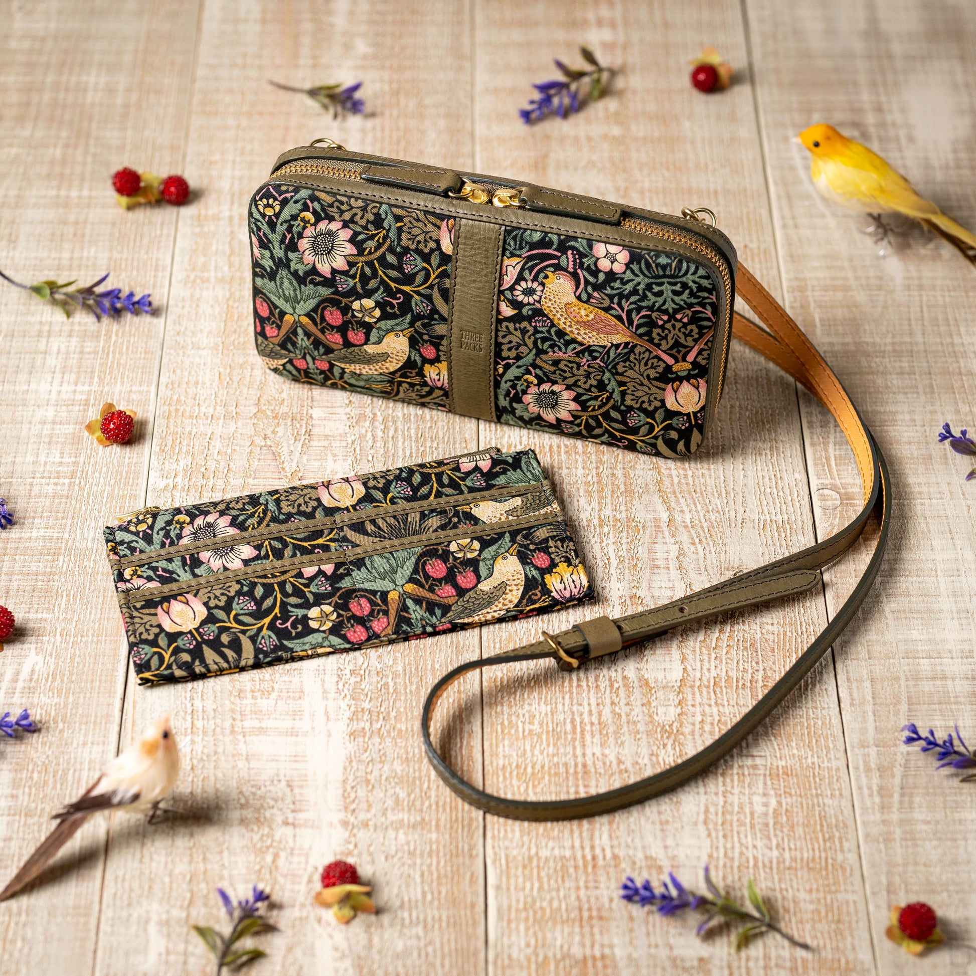 ウィリアムモリスの"いちご泥棒"生地を使用し、鳥(つぐみ)たちが向かい合うように丁寧に柄合わせを行い、イタリア製の上質なタンニン鞣し牛革 "ミネルバボックス" を使用することで、大人可愛い上質なミニバッグに仕上げました
